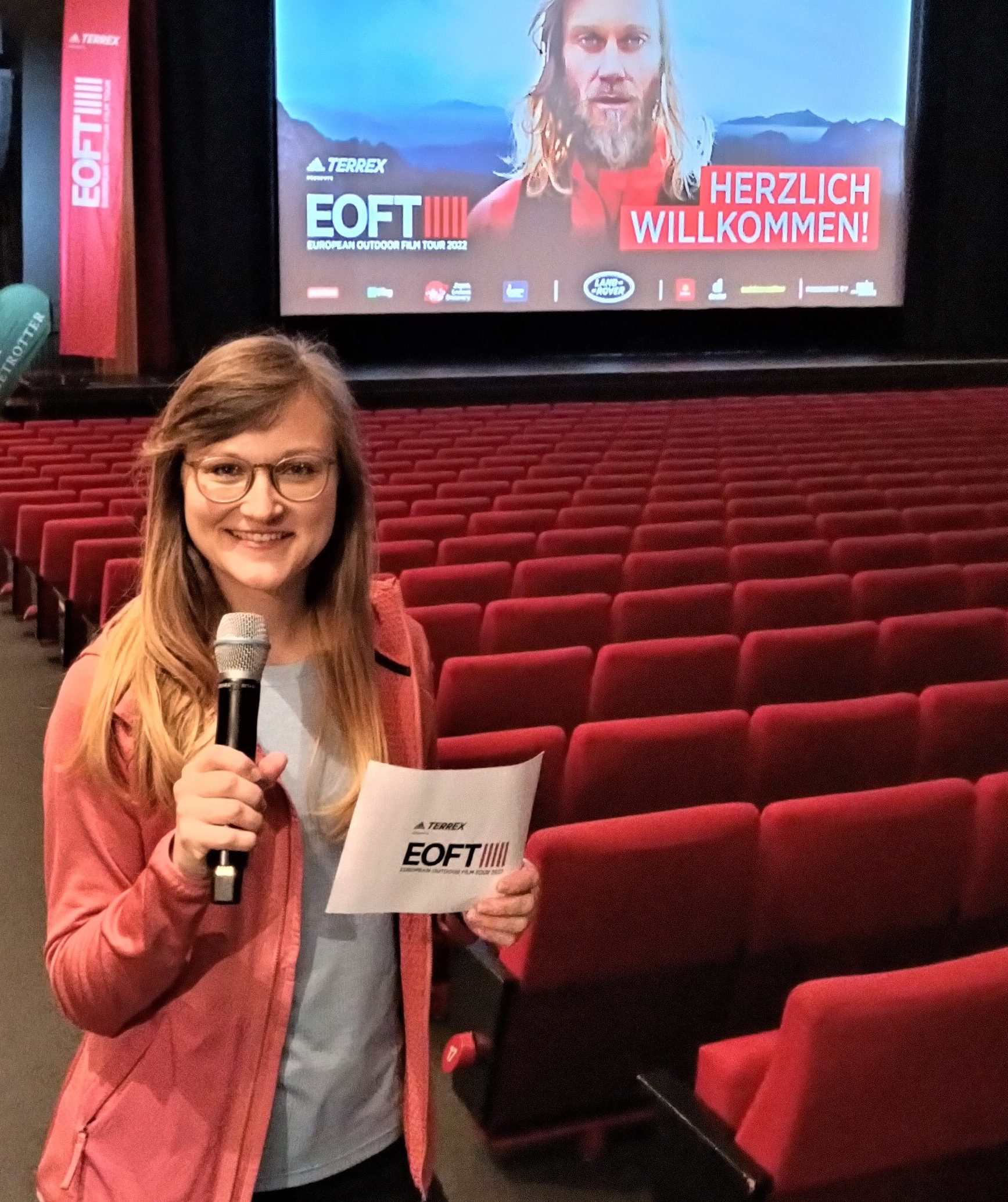 Im Januar 2022 startete ich als freiberufliche Event-Moderatorin bei der European Outdoor Film Tour (EOFT), bei der OCEAN Film Tour und der BANFF Mountain Film Festival Tour. Mittlerweise habe ich über 40 Film Tour Events moderiert in verschiedenen Städten, wie Zürich, Luxemburg, Breslau, Köln, Frankfurt oder Hamburg und auch in meiner Heimatstadt Berlin – in der Urania vor 700 Zuschauern (siehe Foto oben).